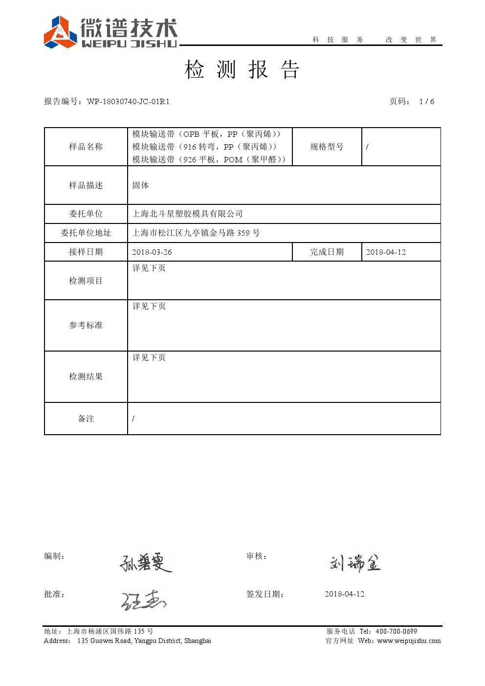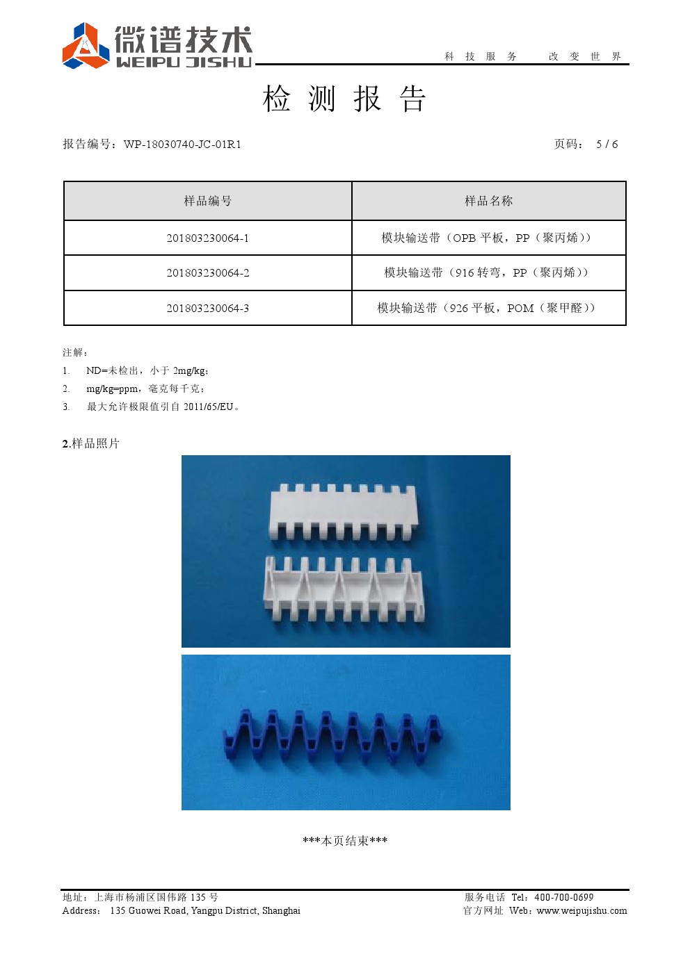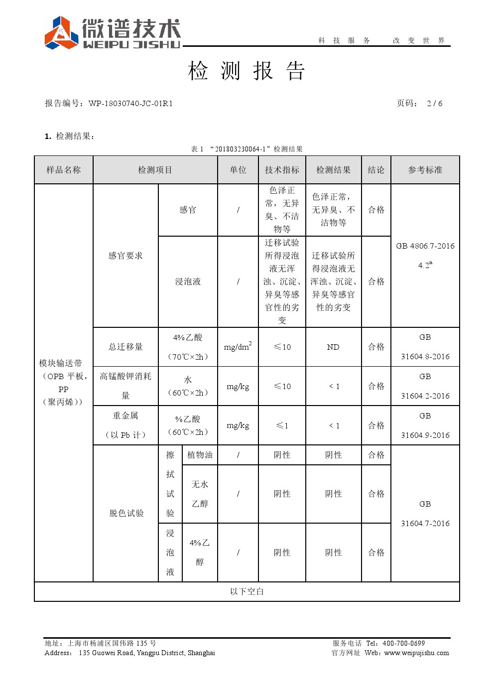 食品安全第一,对接新建的团体标准: T/31SAFCM03.22018(模块输送带),委托第三方进行检测。