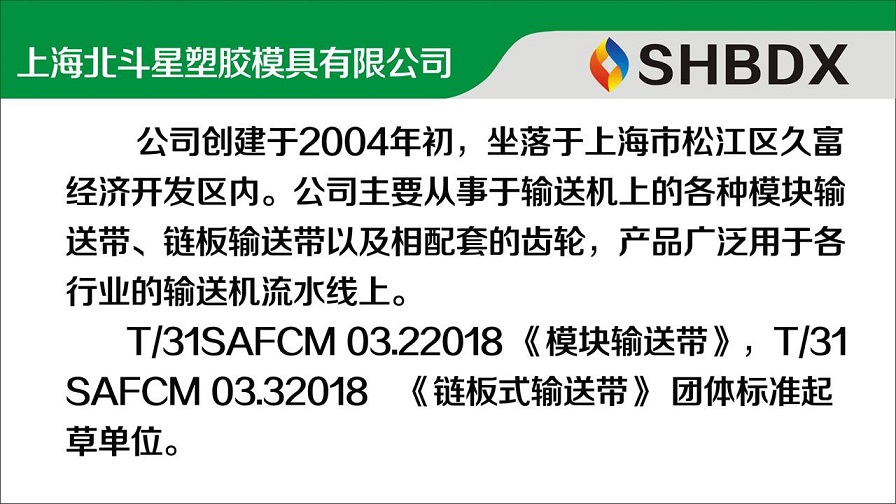 上海北斗星塑胶模具有限公司创建于2004年初。公司主要从事于智能制造过程中用于传送物料的模块输送带、链板输送带以及相配套的齿轮的生产加工。经过多年的研发制造,目前成熟并