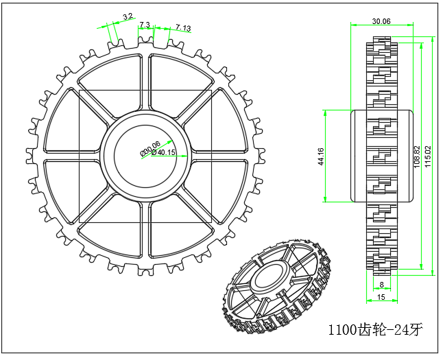 1100齿轮24牙,外径115,厚度30,有25、30、40圆孔键8,也有40方孔,POM注塑成型