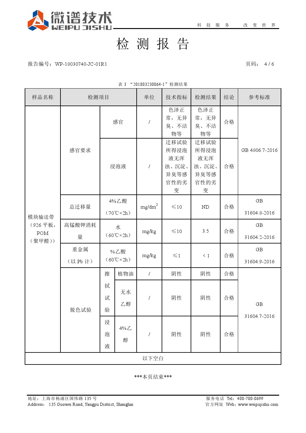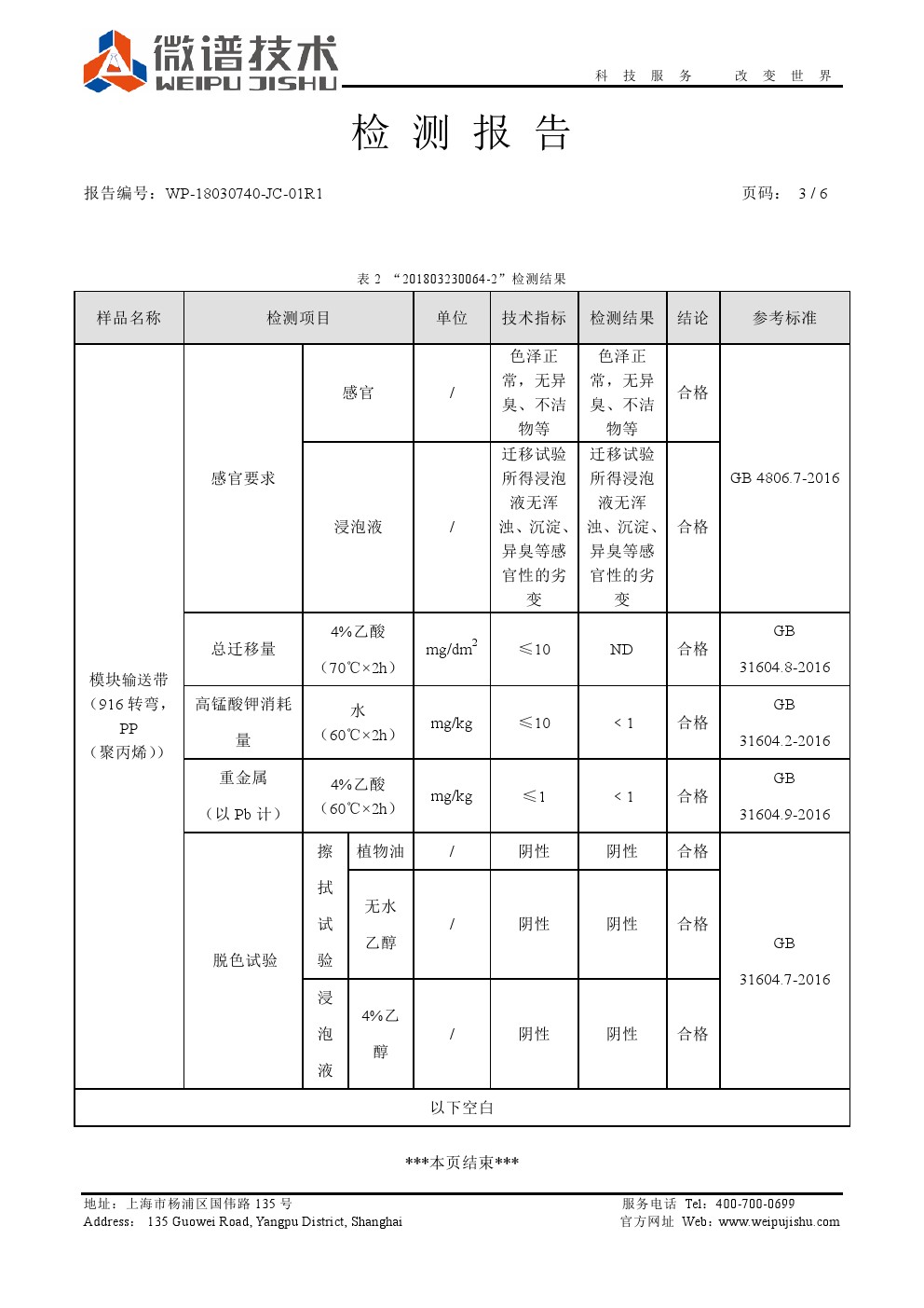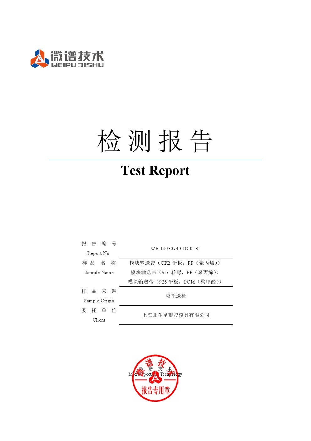 食品安全第一,对接新建的团体标准: T/31SAFCM03.22018(模块输送带),委托第三方进行检测。